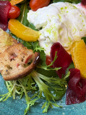 A primeira parada é a Toscana, com a leveza da Panzanella, pão levemente tostado, tomates frescos, picles de beterraba, laranja e a suavidade da muçarela de búfala cremosa, finalizada com azeite de manjericão.
