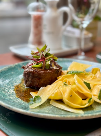 Na sequência, o cardápio percorre novos caminhos da Itália. O Medaglione di Manzo (acima) traz o aconchego do filé mignon servido com papardelle ao parmesão, em uma combinação que exalta simplicidade e requinte. Já o Filetto di Branzino, robalo grelhado sobre risoto de alho-poró, traduz o frescor das regiões costeiras italianas. E, para os que buscam leveza, o Risoto de Pupunha com Alho-poró Crocante apresenta um equilíbrio delicado entre textura e sabor.