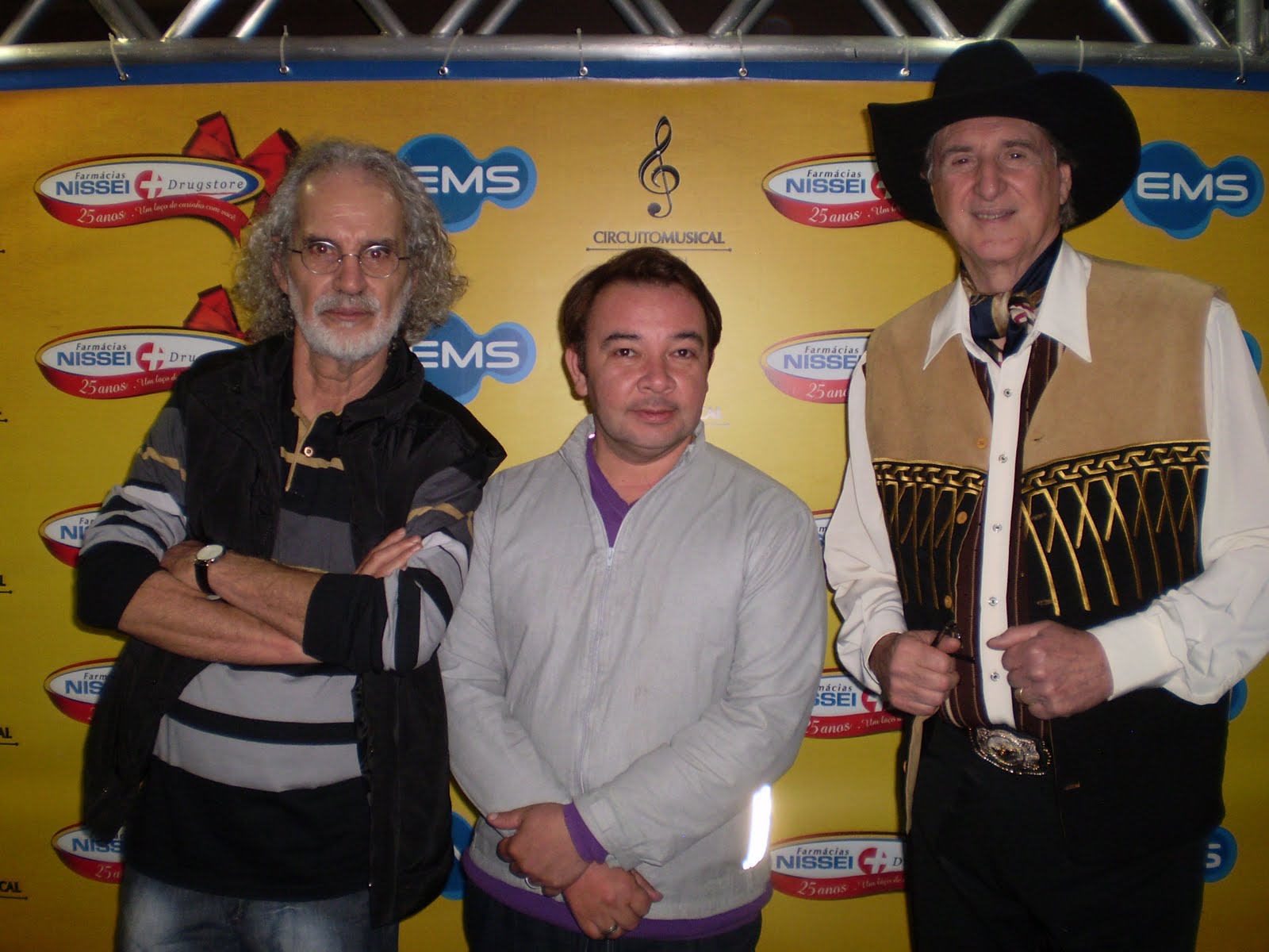 Renato Teixeira, o titular desta coluna, o Jornalista João Nunes e o cantor Sérgio Reis, na noite de quinta-feira, no Teatro Positivo, em Curitiba, por conta do Circuito Musical Nissei, que tem como o bjetivo levar música de qualidade à classe médica do Paraná, além de convidados do empresário Sérgio Maeoka, presidente de um dos maiores grupos farmacêuticos do país, a Rede de Farmácias Nissei.