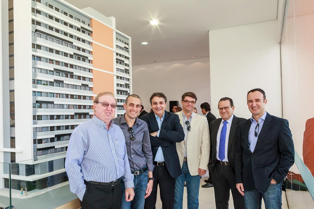 Vitor Wjuniski, sócio diretor da Stuhlberger, Seme Raad Filho, sócio diretor da Monarca, João Auada, diretor de negócios da TECNISA para a Região Sul, Gerson Silva, diretor comercial da BR Brokers, Osvaldo Gomes dos Santos, presidente da Coelho Fonseca e consultor de planejamento do empreendimento, e Cristiano Viana, superintendente de vendas da Tecnisa, durante a apresentação das unidades decoradas do empreendimento imobiliário “Novo Centro” dirigido para o segmento comercial. O imóvel possuirá 210 conjuntos de escritórios e quatro lojas, que contarão com infraestrutura completa voltada para ambientes corporativos e arquitetura que valoriza o centro da cidade.