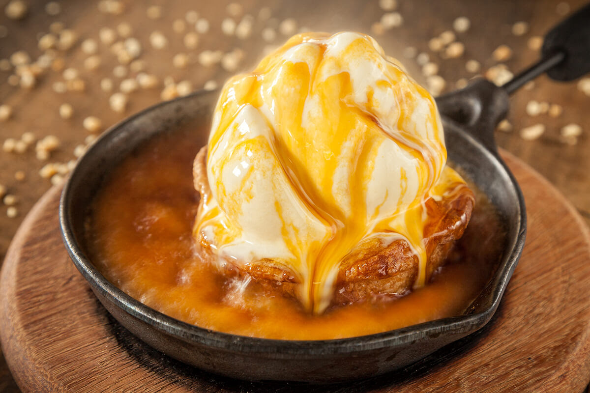 Já para o prato principal, fica a dica para saborear Guinness Steak, feito de escalopes de mignon cobertos com um saboroso molho de cheddar com palmito e acompanhamento de arroz e fritas. E de sobremesa, a clássica – e irresistível – Sizzling Apple Pie, foto a baixo, uma torta de maçã sobre uma leve massa folhada servida em uma chapa quente, acompanhada de sorvete de creme com calda de caramelo.