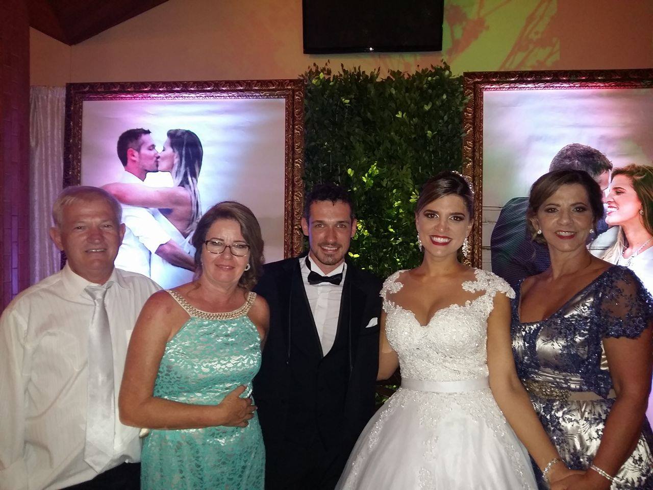 Após a cerimônia religiosa, mais de duzentos convidados foram recepcionados no Itamirim Clube de Campo, juntamente com os pais dos noivos. Na foto, Eliseu e Arlete Bersen Soprano, Arthur, Nayara e Lucy Santos Pinto