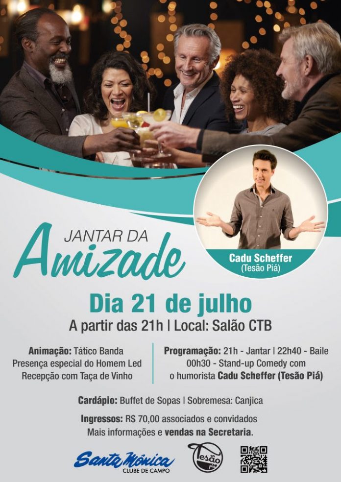 No dia 21 de julho, o Santa Mônica Clube de Campo promove o Jantar da Amizade, no Salão CTB. O evento, em comemoração ao Dia do Amigo, reúne aqueles que são tão chegados quanto irmãos para brindar a vida, a alegria e o companheirismo. O jantar será servido às 21h e o baile começa às 22h40. A animação da noite ficará por conta da Tático Banda com performances e terá presença especial do Homem Led. Outra atração especial será o Stand-up Comedy com o humorista Cadu Scheffer do Tesão Piá.