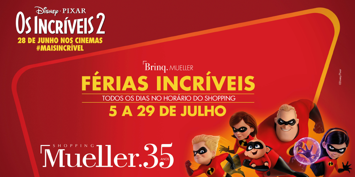 O Shopping Mueller preparou uma programação especial para as famílias nas férias de inverno. Entre os dias 5 a 29 de julho, o evento inspirado no filme “Os Incríveis 2” da Disney.Pixar estará no Shopping Mueller para divertir toda a família. A novidade neste ano, é que a atração funcionará em horário inédito, de segunda-feira a sábado, das 10h às 22h, e no domingo, das 14h às 20h, no piso L4. A diversão está garantida durante todo o horário de funcionamento do shopping. Evento aberto ao público.