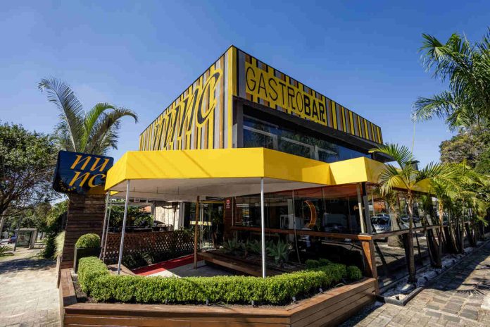O badalado escritório de arquitetura e design Studio Guilherme Bez assina o projeto do NUNC. Uma ambientação solar e vibrante, cheia de energia, é ressaltada pelos tons de amarelo e laranja da decoração, em contraste com paredes escuras texturizadas. A ideia é aproveitar o dia e a noite, viver o agora, que é o conceito essencial do NUNC. Teto e paredes ganharam pinturas da artista Rosângela Grafetti e esculturas de outros artistas plásticos. O colorido da arte chama a atenção e cria vários espaços instagramáveis. Na fachada, o nome NUNC Gastrobar é escrito por elos de correntes de alumínio em tons de dourado, prata, preto e amarelo, trabalho presente em toda a fachada, passando uma imagem de modernidade. São quatro ambientes no andar térreo, com dois salões, bar e deck. No andar superior ficam o lounge, pista de dança, palco e bar. O gastrobar tem capacidade para 250 pessoas.
