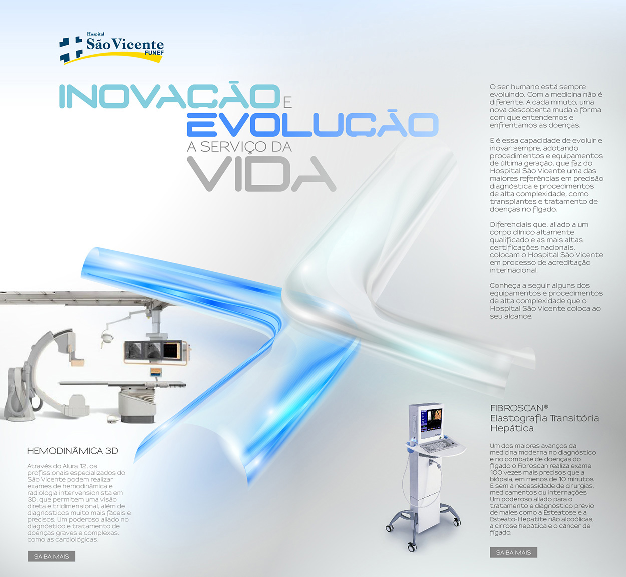 Veiculada em grandes veículos de comunicação de Curitiba, a campanha aposta nos conceitos que transformaram o Hospital São Vicente – FUNEF em um dos maiores e mais respeitados do Brasil, e destaca dois equipamentos de última geração que, aliados a um corpo clínico altamente qualificado, fazem do hospital curitibano referência em precisão diagnóstica e procedimentos de alta complexidade: Hemodinâmica 3D e Elastrografia Transitória Hepática.