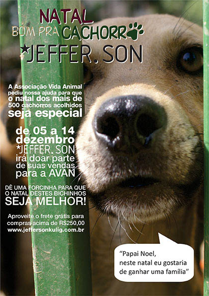 Neste fim de ano, o estilista Jefferson Kulig e a Associação Vida Animal, que abriga atualmente mais de 600 cães, formaram uma parceria para arrecadar fundos para a organização e promover a doação e adoção. Atualmente, o espaço da instituição não comporta todos os animais, e a ONG precisa de recursos para expandir seu espaço e realizar compra de ração A campanha “Natal bom pra cachorro” vai reverter parte das vendas de todo site Jefferson Kullig para a Avan, de 05 a 14 de dezembro. Parabéns pela iniciativa, a coluna parabeniza o estilista.