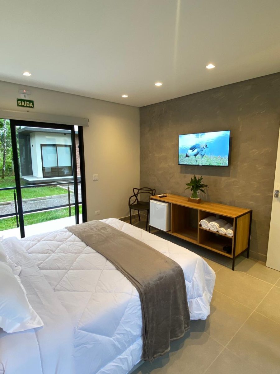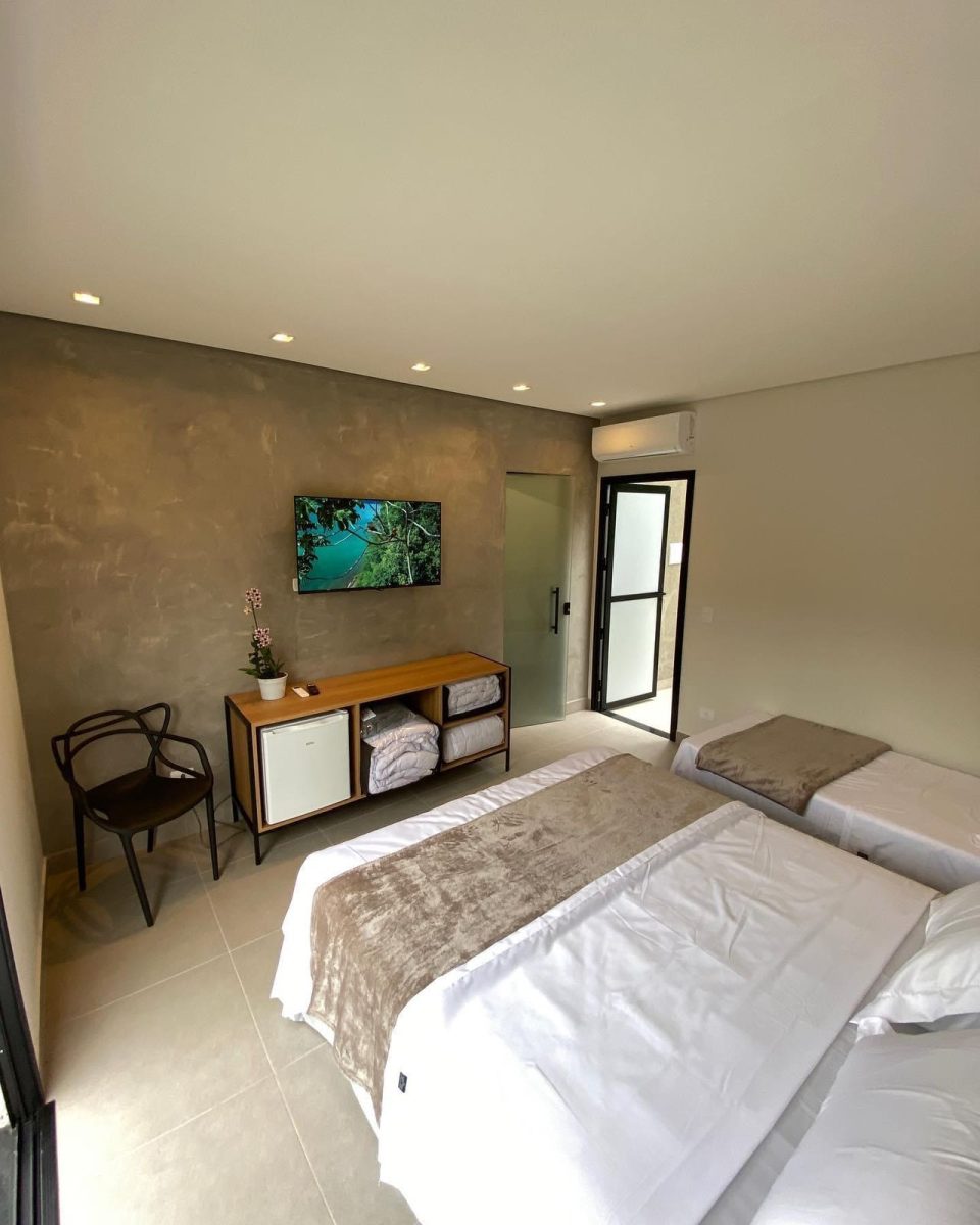 Cada quarto contém ar condicionado, frigobar, TV com acesso a plataforma de streaming, toalhas, kits de produtos para banho e mini varal externo