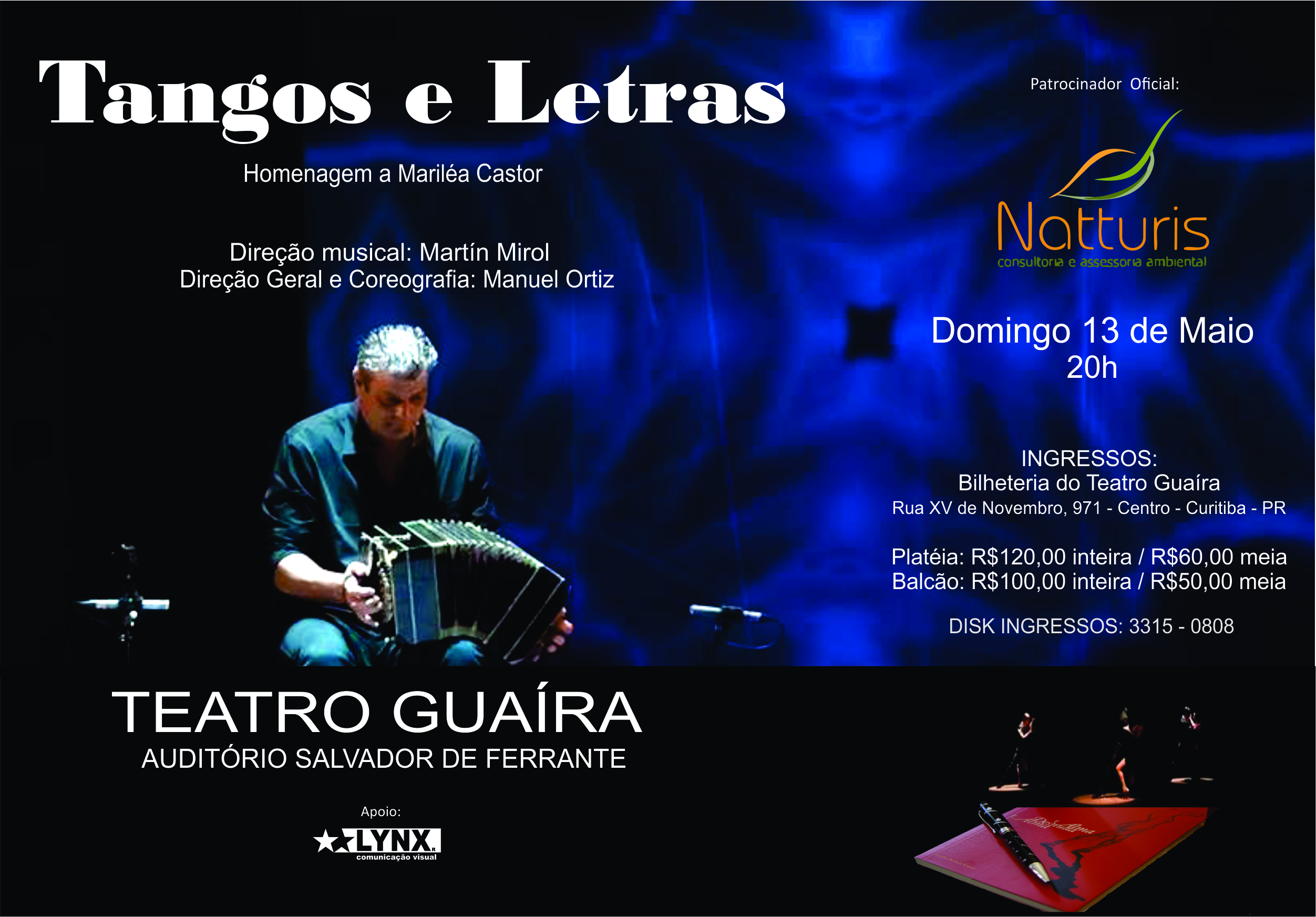 “Tangos e Letras”, de Manuel Ortiz, produtor, bailarino e coreógrafo argentino, será apresentado no dia 13 de maio, no Guairinha, em Curitiba. “O show foi idealizado com base nas poesias de Mariléa Castor que transmitem uma mensagem de vida para as mulheres que encontram no tango o sinônimo de viver, respirar e ser feliz, sem preconceito”, explica o criador do musical.