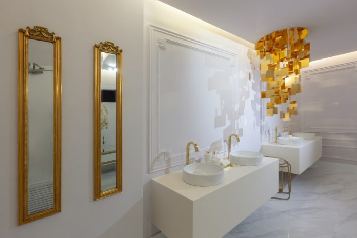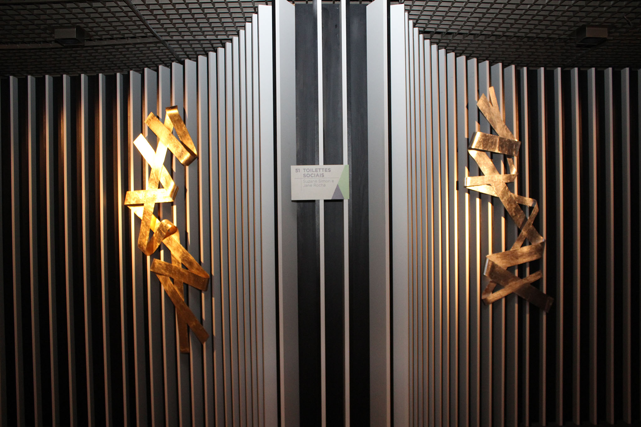 No banheiro funcional, das arquitetas Jane Rocha e Suzane Simon, a artista apresenta as obras Tramas – duas esculturas de parede na entrada do ambiente e também um par de móbiles intitulados “Reflexos”, no qual traz a profusão dos reflexos, brinca com o ponto de vista de quem observa e faz um convite à análise da interferência da luz em todas as superfícies, inclusive em quem somos.
