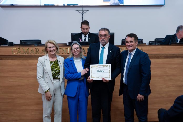 Rached Hajar Traya, diretor-presidente da Unimed Curitiba, foi homenageado sessão solene realizada na Câmara Municipal de Curitiba (CMC) nesta quarta-feira (15). A honraria é um reconhecimento pelo Dia do Médico, celebrado em 18 de outubro. A cerimônia foi presidida pelo vereador Tico Kuzma (PSD-PR), atual presidente do Legislativo Municipal, que fez a entrega do certificado ao médico proctologista e dirigente da maior operadora de planos de saúde do Paraná. Médicos conselheiros do Conselho Regional de Medicina do Paraná (CRM-PR) e renomados profissionais prestigiaram o momento que destaca a trajetória e as contribuições dos médicos para a área da saúde na capital paranaense.
