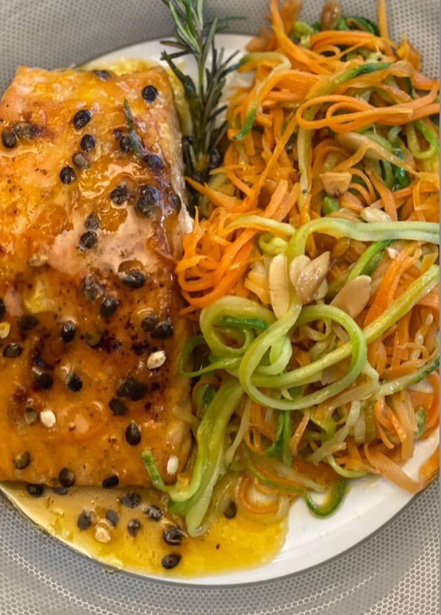 Salmão grelhado ao molho maracujá com manjericão. Acompanha: Spaghetti de legumes na manteiga com amêndoas laminadas.