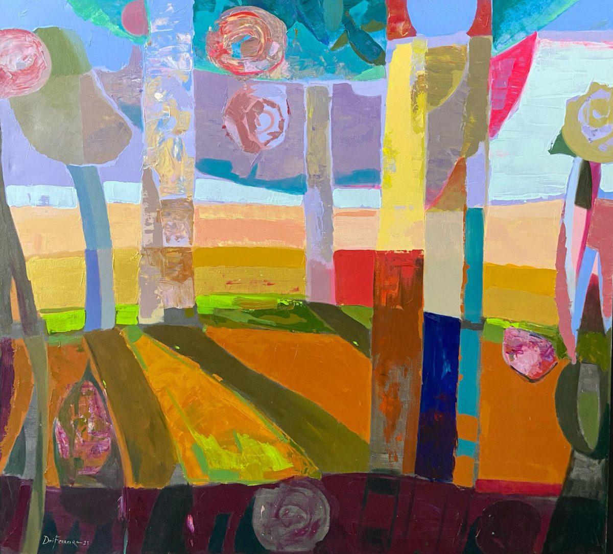 As obras de Dhi Ferreira propõem uma imersão sensível na relação entre o ser humano — especialmente o feminino — e os ciclos da natureza. Com uma paleta vibrante e formas fluidas, o artista evoca imagens oníricas onde mulher, flores, frutos e paisagens se fundem em um só corpo simbiótico. Para ele, a pintura não deve ser interpretada por um viés racional ou intelectualizado, mas experimentada com emoção e empatia.