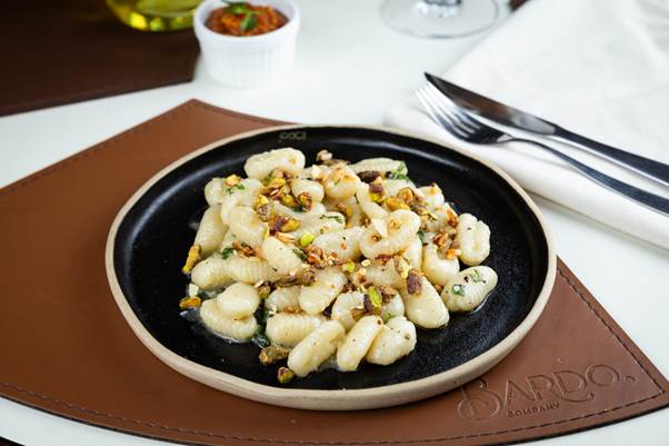 No almoço, as entradas revelam o apreço pelo equilíbrio mediterrâneo: a Bruschetta di Pomodori e Bufala, servida sobre ciabatta com tomate fresco, tapenade de azeitonas, mozzarella di bufala e manjericão, oferece um início aromático e luminoso; já o Dolce Crema Pistaccio é um creme quente de parmesão e cream cheese, tomate confit e o toque agridoce do pistache crocante acompanhado de pão de fermentação natural. Entre os principais, o Bardo aposta em três interpretações: o Panino Stracciatella, com sua combinação entre a cremosidade da stracciatella de búfala, a personalidade da mortadela e a vivacidade do pesto; a Lasagna Formaggi alla Bolognese e Bacon, que inverte camadas para trazer a bolonhesa por cima e bacon ao forno; e o Gnocchi Sardi al Burro, que, em manteiga de sálvia, é finalizado com crocante de amêndoas e pistache. Para finalizar, a casa oferece a dupla de sobremesas que transitam entre o cremoso e o cítrico: o Gelato Dulce de Leche al Cumaru servido com espresso curto, combinação que remete a um affogato brasileiro, e o Mousse al Limone di Sicilia, apresentado na taça Martini.
